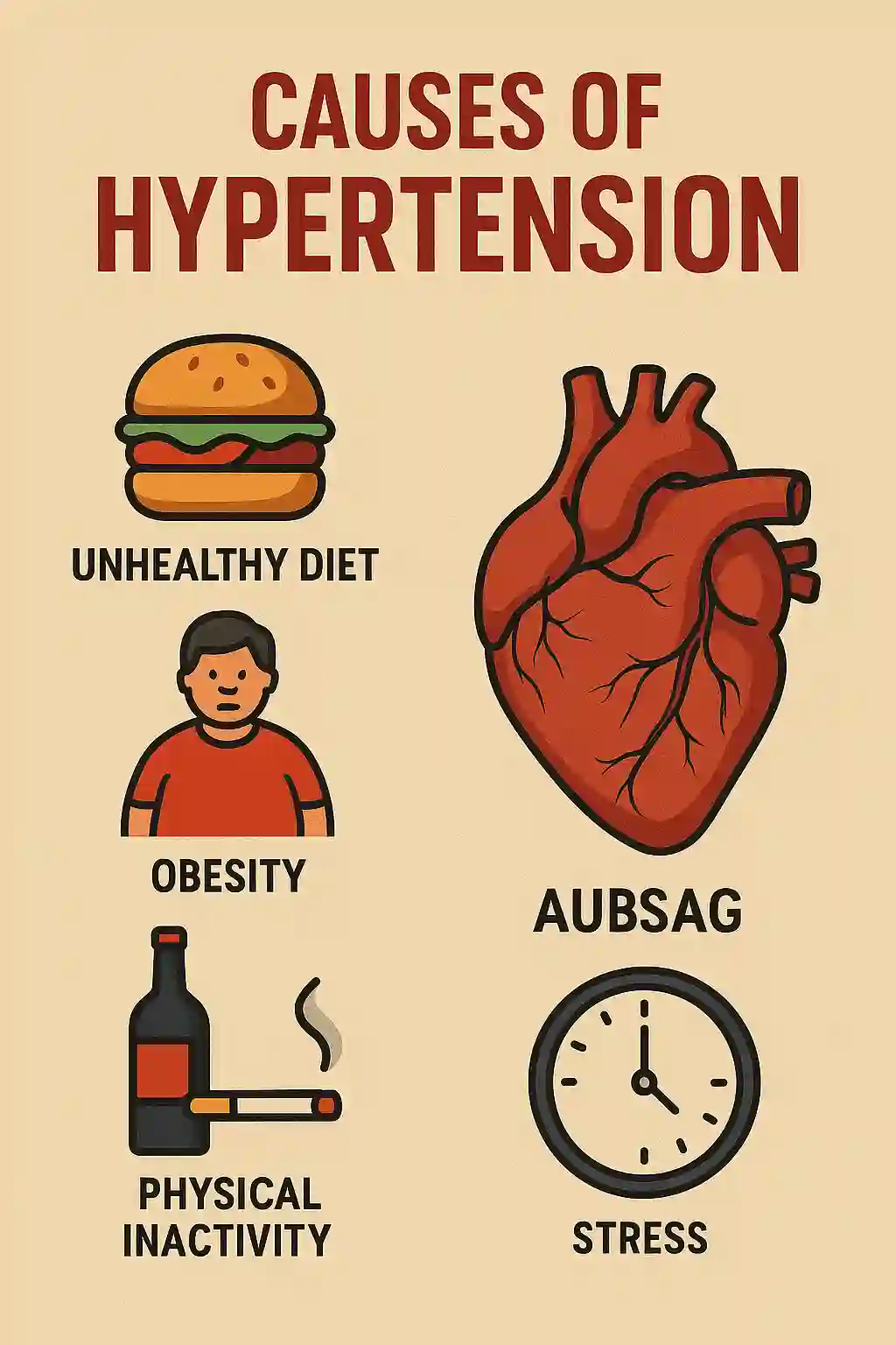 The main cause of hypertension is often a combination of genetic factors, poor diet (high in salt and low in potassium), lack of physical activity, obesity, excessive alcohol consumption, and chronic stress.